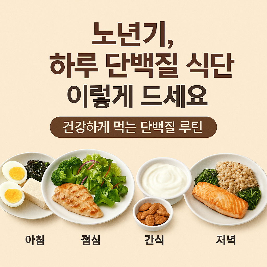 “노년기, 하루 단백질 식단 이렇게 드세요 – 맛있게 건강 챙기기”📌 인트로“뭘 먹어야 할지 모르겠어요.”“고기 먹자니 부담스럽고, 밥만 먹자니 허전하고…”노년기에는 식욕도 떨어지고 소화력도 약해지지만,단백질은 반드시 챙겨야 하는 영양소입니다.오늘은 무리 없이 실천 가능한 노년을 위한 단백질 식단 예시를 소개합니다.🍳 본문✅ 하루 단백질 권장량노년기에는 체중 1kg당 1~1.2g의 단백질이 필요합니다.(예: 60kg → 하루 약 60~72g)한 끼에 20~25g씩 나누어 섭취하면 가장 효율적입니다.🍽 식단 예시🍚 아침삶은 달걀 2개 (약 12g)두부 반 모 (약 10g)구운 김 + 현미밥 + 된장국→ 흡수율 좋은 동·식물성 단백질 조합🥗 점심닭가슴살 100g (약 23g)야채 샐러드 (올리브유 ..